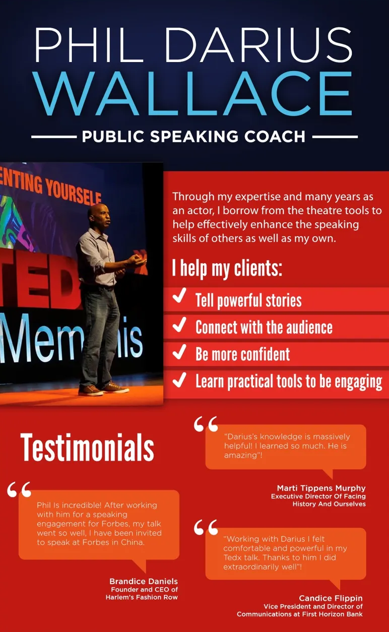 As a Speaking Coach, he has worked with companies such as Autozone, Central Delivery, My Simple RX, Commercial Advisors, Nucor Steele, Sycamore Pictures and TED X Memphis.